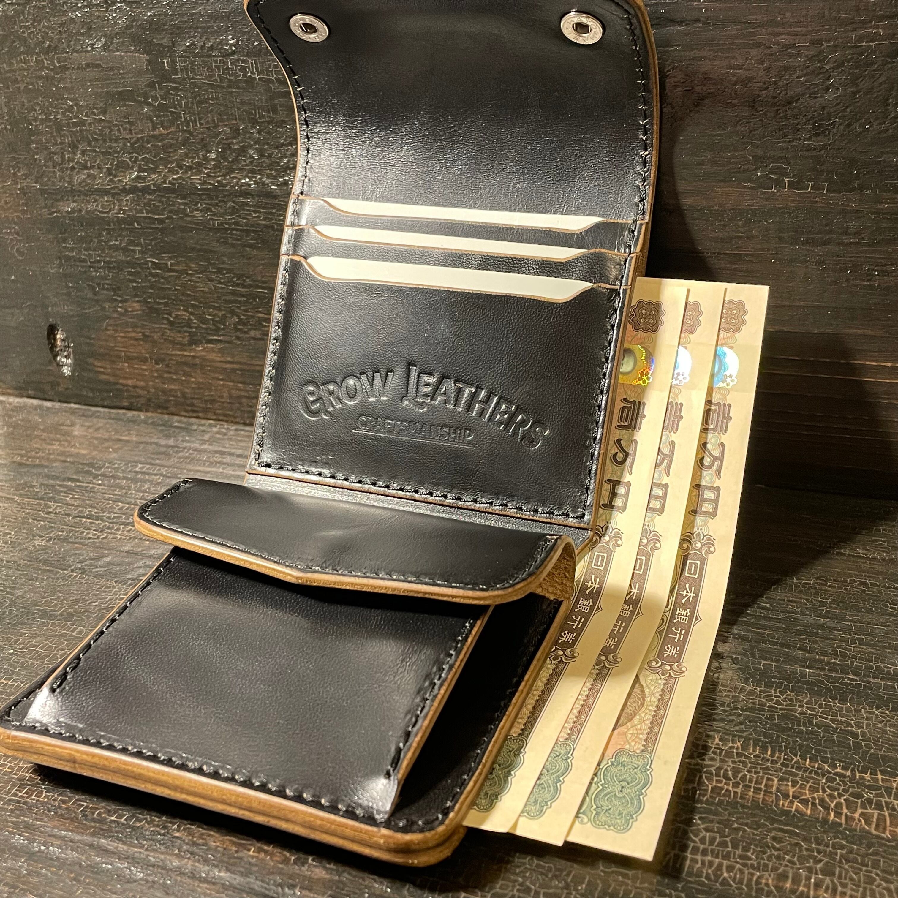 ウォレットを開けば片手で小銭、カード、お札の出し入れがしやすい様、設計製作しています。